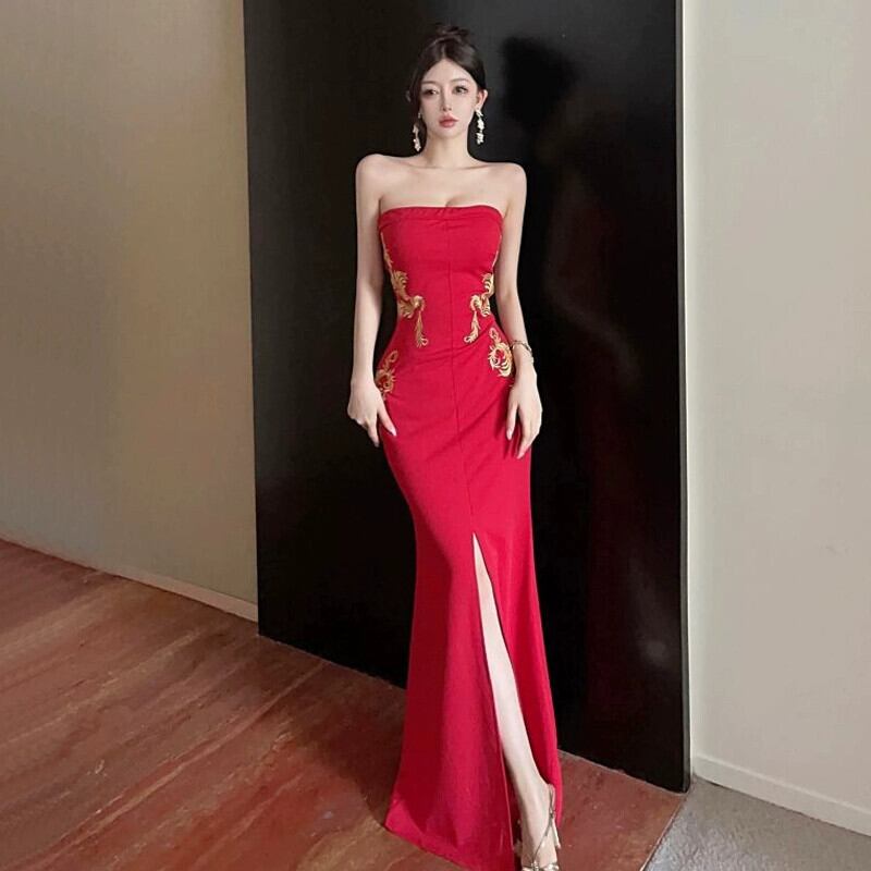 セクシーなイブニングドレス、ロングスカート、女性年次総会宴会、西洋風の女神スタイル、セクシーなスリットロングチューブトップドレス yeyij63504532177