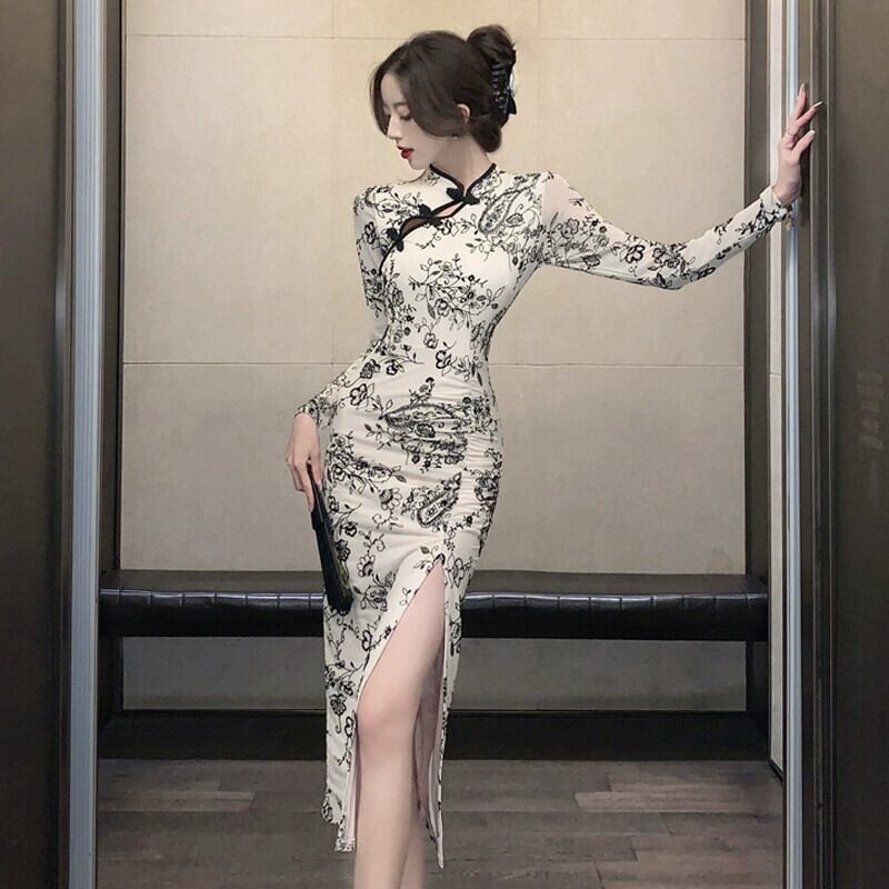 中国風の改良されたチャイナドレス 2022 秋の新作婦人服軽くて成熟した気質レトロなミッドレングス長袖ドレス ロング オータム 秋物 yeyij81368461236