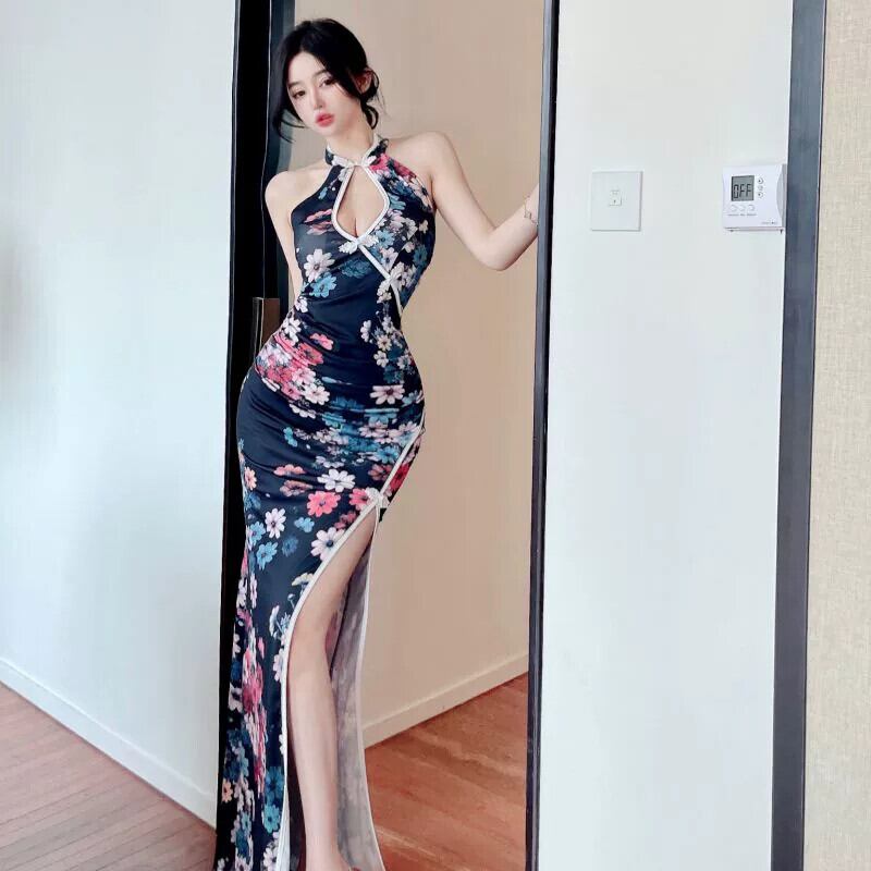 チャイナドレスイブニングドレスロングスカート女性の中国風の改良版宴会気質セクシーな中空スリットホルターネックドレス yeyij72413233362