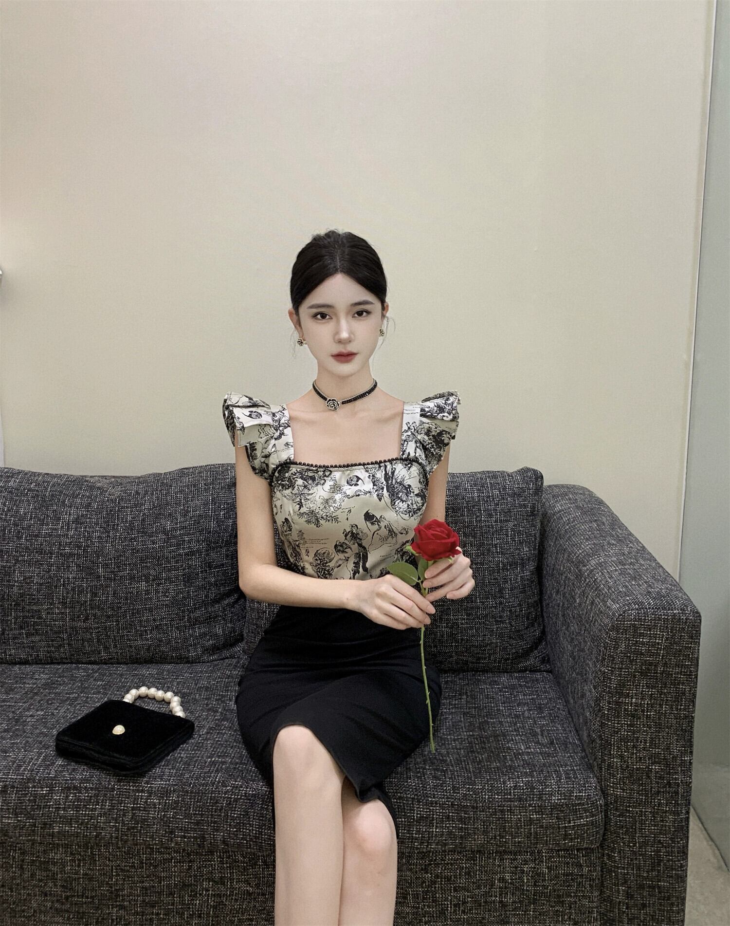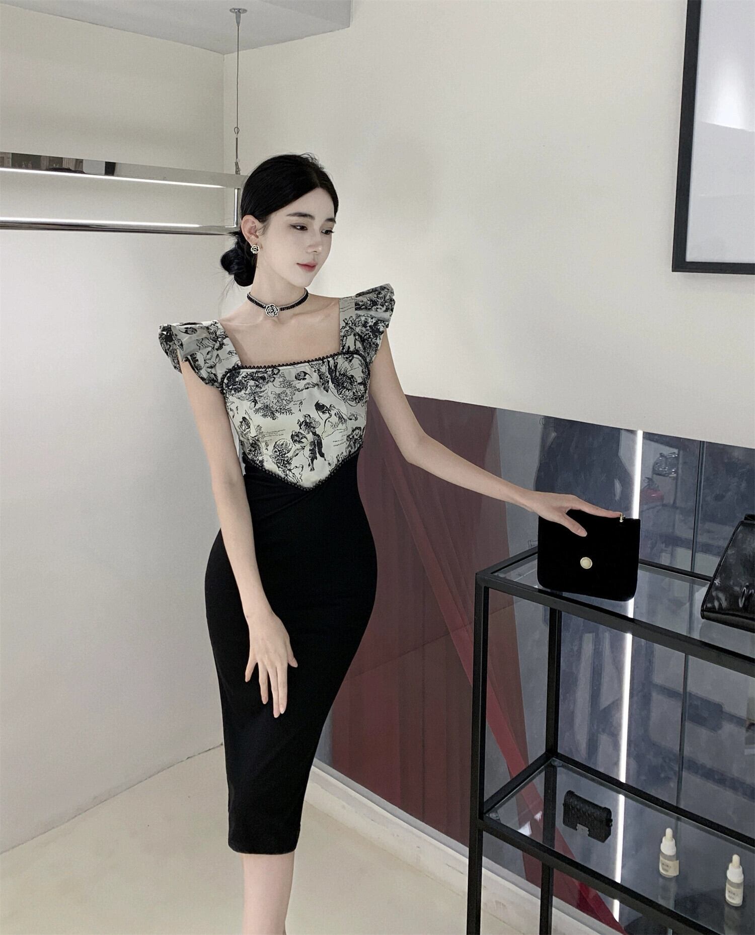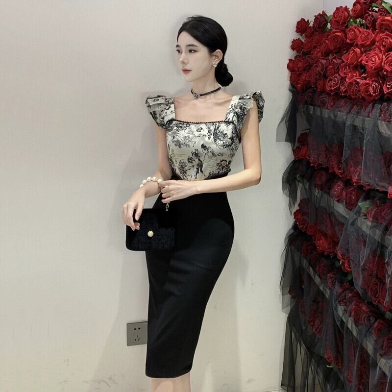 ヘップバーン スタイルのイブニング ドレス、フェミニン、ライト、ラグジュアリー、ニッチ、ハイエンド、フレンチ スタイル、セクシー、フライング スリーブ、見事なスクエア ネック ドレス スクウェア yeyij58058437003