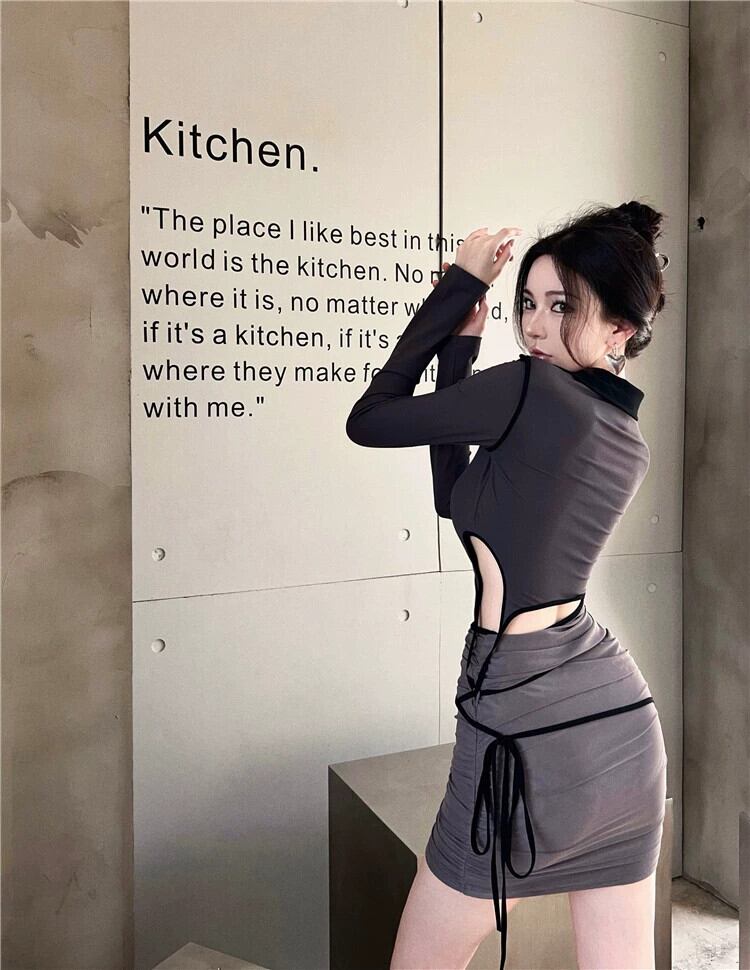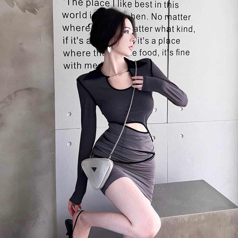 Youayousha レディース秋ニッチデザインセクシーな中空中空レース長袖ヒップカバードレス ロング オータム 秋物 yeyij13563566719