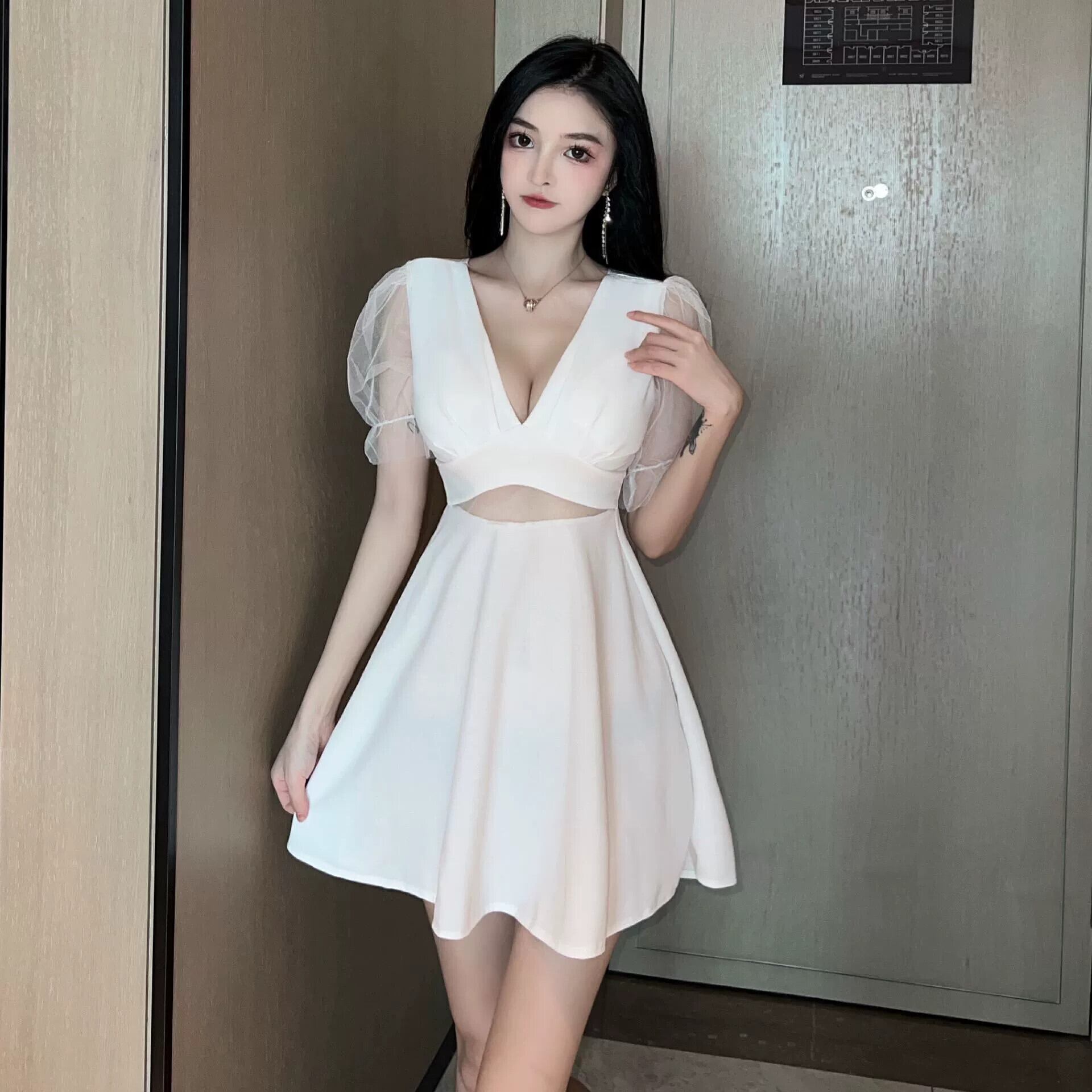 ナイトクラブの女性のセクシーな作業服ローカットディープ V ネックフレンチパフスリーブウエスト痩身ドレス Vネック yeyij92237567312