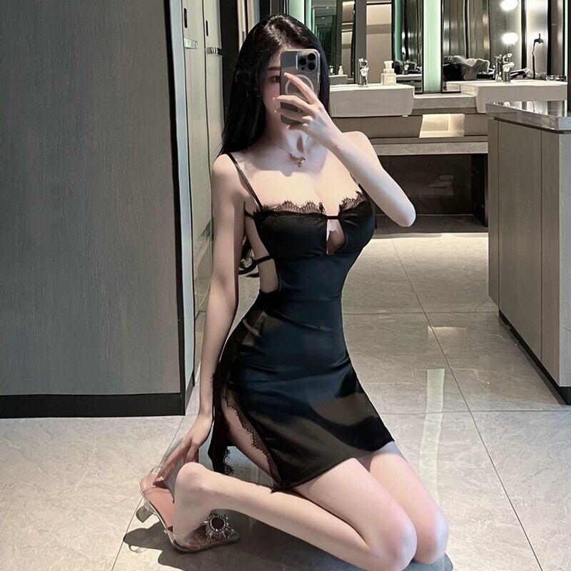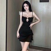 ナイトクラブの女性の黒のセクシーなオーバーオール背中の開いたローカット深い V ネックのハイスリット サスペンダー ドレス ブラック Vネック yeyij53228011926
