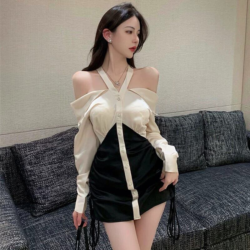 初秋の女性の新しいデザインニッチシャツドレス西洋スタイルのセクシーなオフショルダー長袖ヒップカバーホルタードレス ロング オータム 秋物 yeyij88101819706