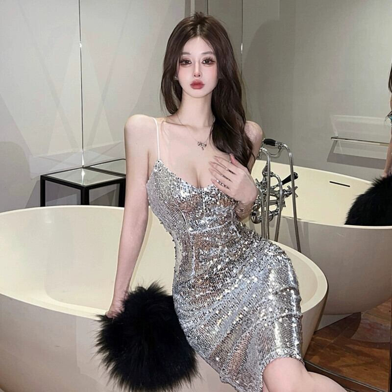 ナイトクラブの女性のナイトクラブイブニングドレス宴会気質輝くスパンコールセクシーなローカットディープ V ネックサスペンダードレス Vネック yeyij19856158817