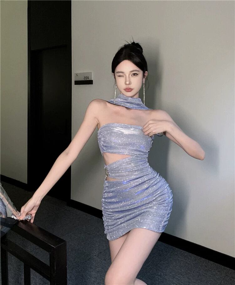 バンケットスタイルのショートドレス、光沢のあるシルクナイトクラブの女性のセクシーなスラントカラーワンショルダーホルターネックチューブトップドレス yeyij71857330817