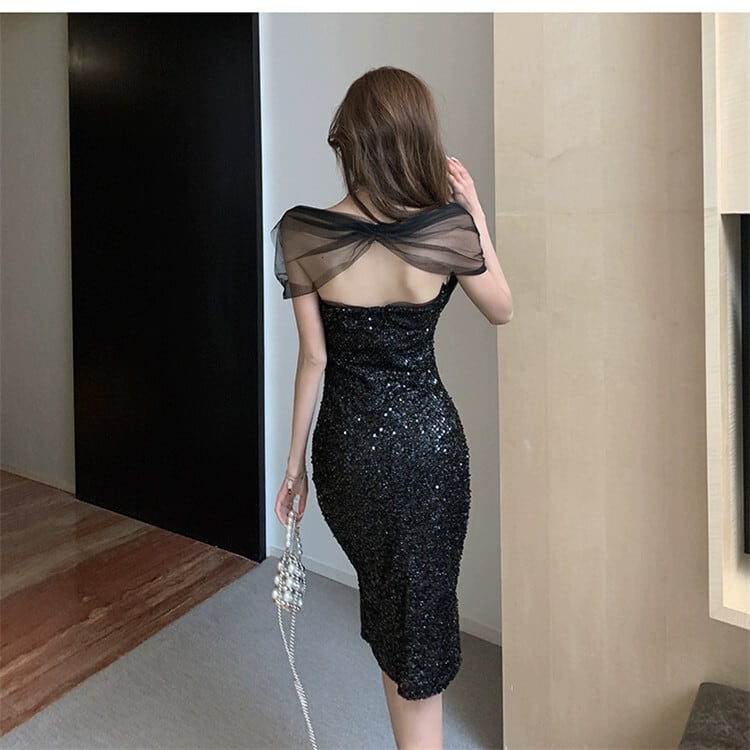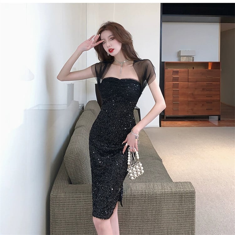 ブラックドレス、軽い高級ニッチハイエンド輝くスパンコール宴会気質セクシーなミッドレングスのチューブトップホルタードレス yeyij26798718489