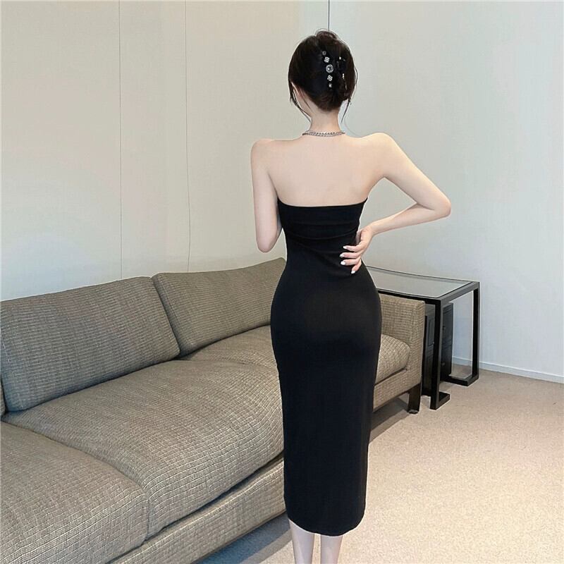 黒のイブニングドレスロングドレス女性シンプルでエレガントな宴会気質セクシーなスリムスリットチェーンホルタードレス ブラック yeyij45047250023