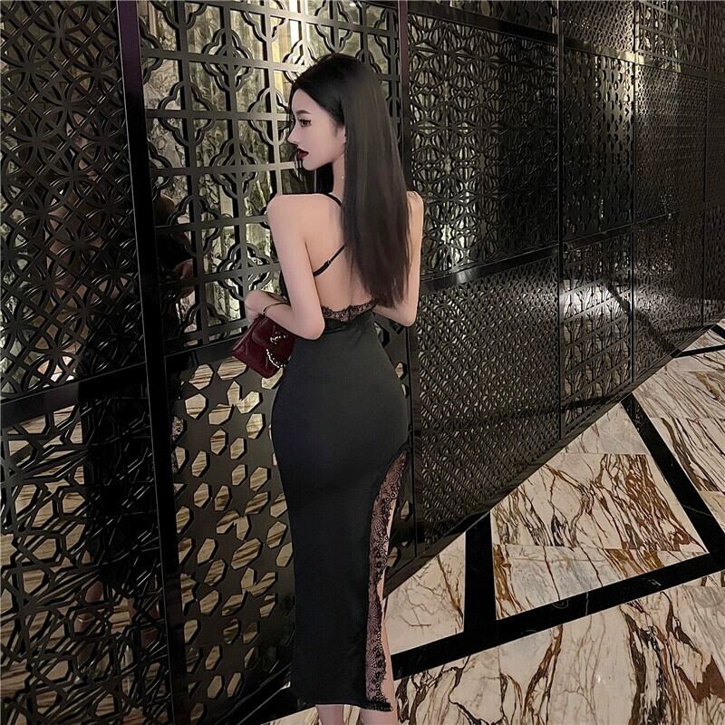 黒のイブニングドレスナイトクラブの女性の宴会気質セクシーな背中の開いたレースのハイスリットサスペンダードレス ブラック yeyij67294776798