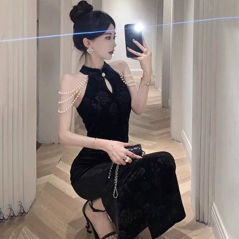 中国風のイブニングドレスの女性、高級中国風のゴールドベルベットエンボス加工年次パーティーセクシーなチャイナドレスの改良版 yeyij43003408268