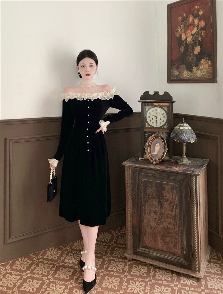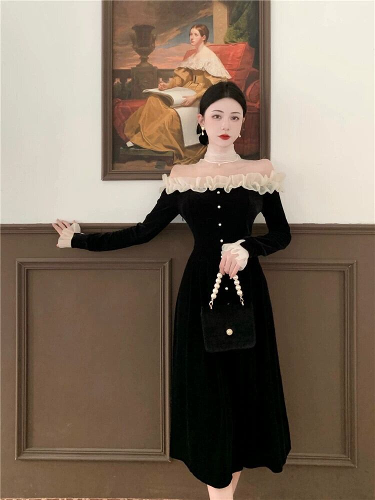 ヘップバーン スタイルのイブニング ドレス、フェミニン、ライト ラグジュアリー ニッチ、ハイエンド フレンチ ブラック セクシーな長袖ワンショルダー ドレス ロング yeyij55137221103
