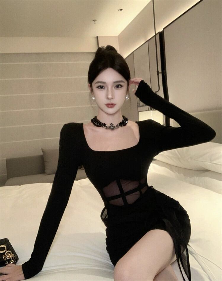 生放送服女性アンカー pogenic ハイエンド黒のセクシーなメッシュステッチ中空ウエストボトリングドレス ブラック yeyij53257771115