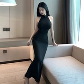 黒のイブニングドレスロングスカート女性ハイエンドナイトクラブ技術者作業服気質セクシーな大きな背中の開いたホルターネックドレス ブラック yeyij68446120239