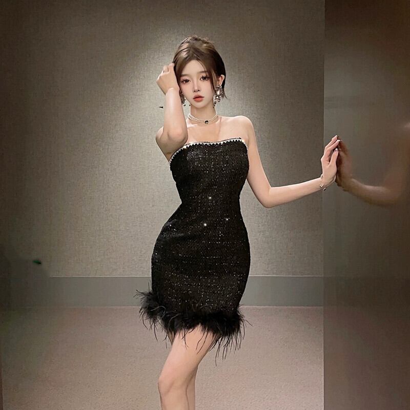 フレンチスタイルのイブニングドレスの女性、ハイエンドの年次パーティーダイヤモンドがちりばめられたダチョウの羽のセクシーなワンショルダーチューブトップドレス yeyij22481682634
