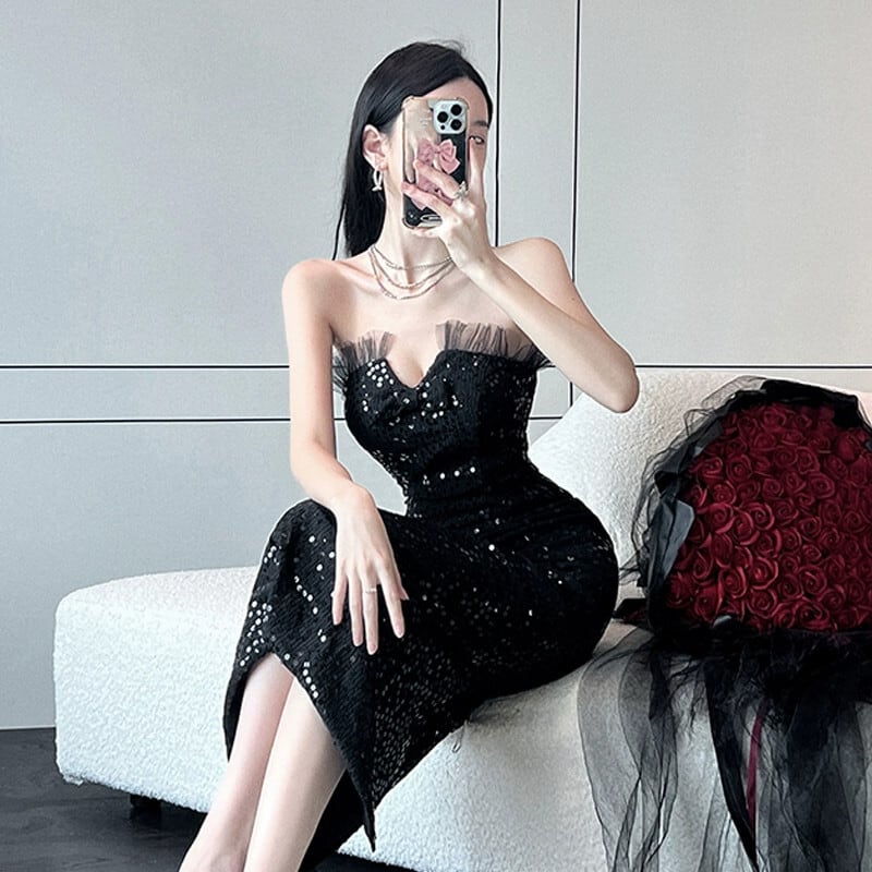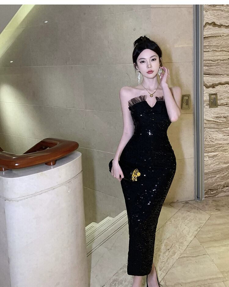 ヘップバーンスタイル黒のイブニングドレスハイエンドライト高級ニッチセレブ宴会気質セクシーなチューブトップスパンコールドレス ブラック yeyij95067983036