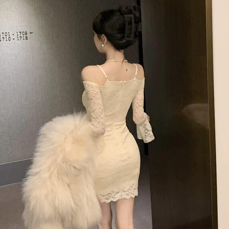 生放送女性アンカーの Pogenic ナイトクラブ純粋な欲望スタイルのセクシーなオフショルダー長袖レース サスペンダー ワンショルダー ドレス ロング ピュア yeyij8216960596