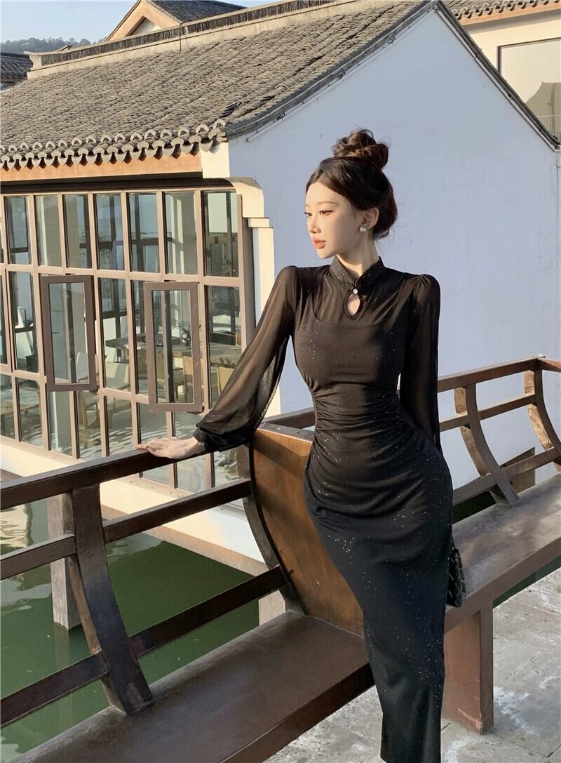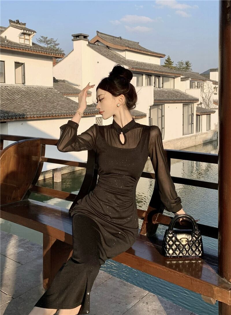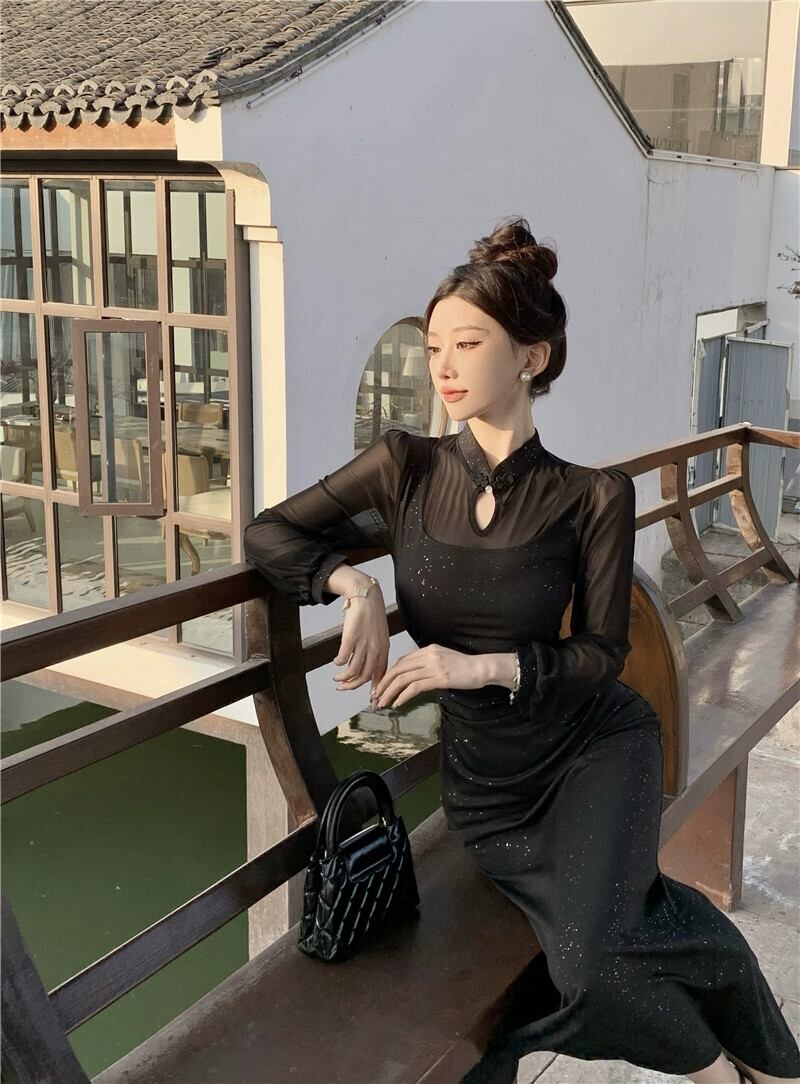チャイナドレス女性の新しい中国風のハイエンドの若いスタイルの黒の光沢のある淑女のような気質メッシュスプライシングミッドレングスドレス ブラック yeyij76564796944