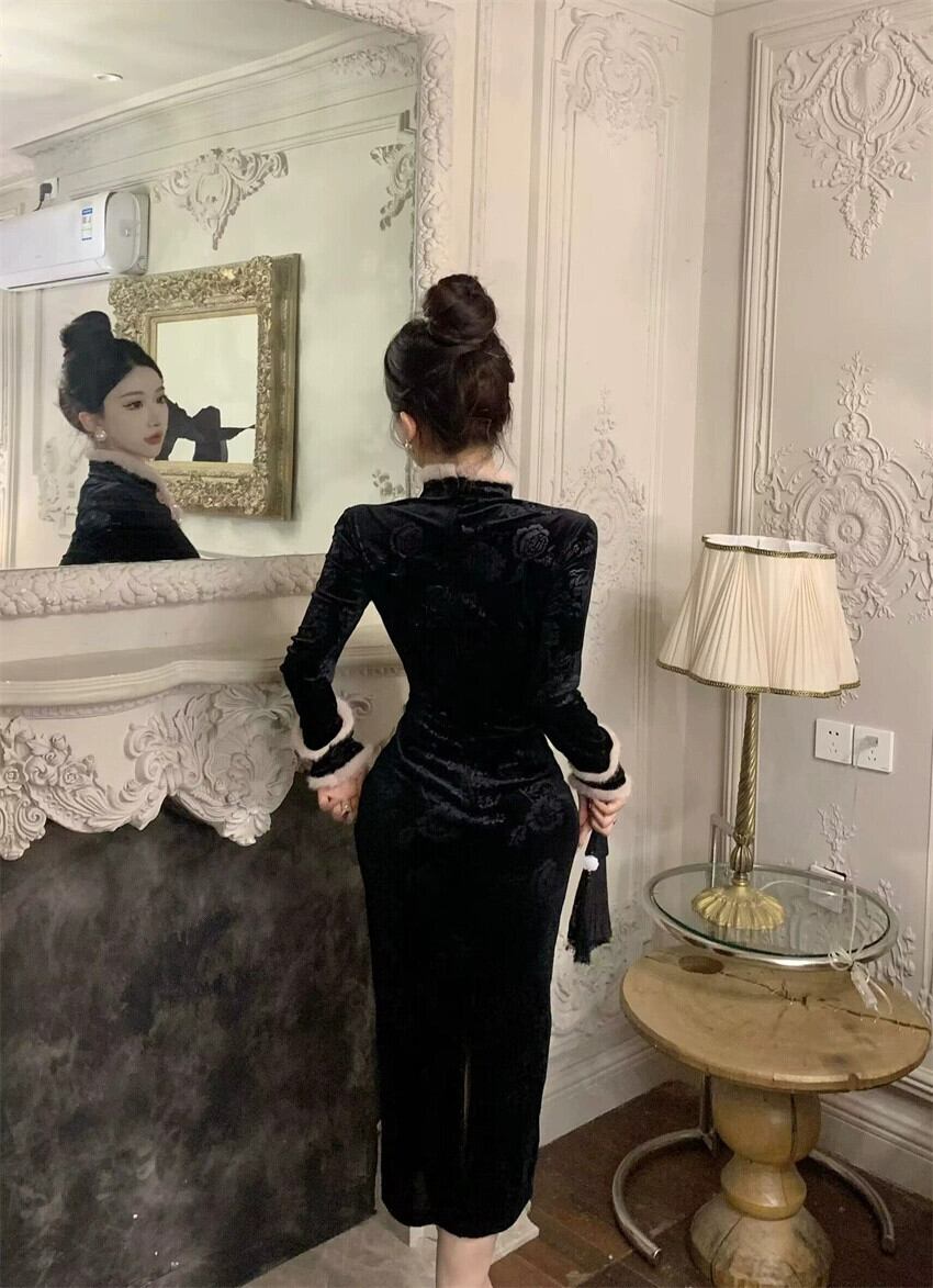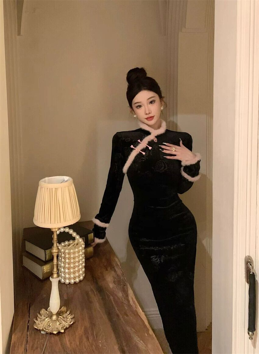 チャイナドレス女性の秋と冬のイブニングドレス年次総会レトロゴールドベルベット淑女の気質改善中国風ミドルドレス オータム 秋物 ウィンター 冬物 yeyij78660150897