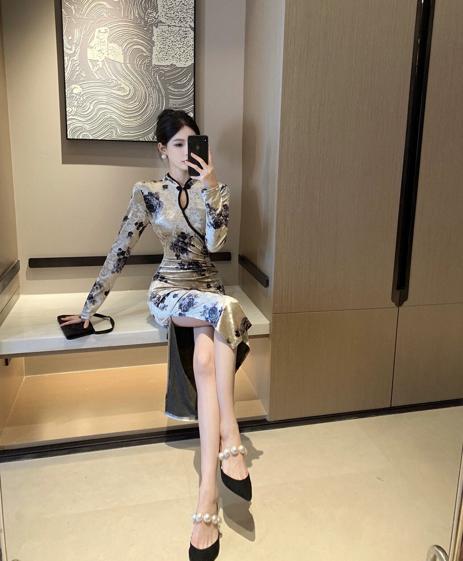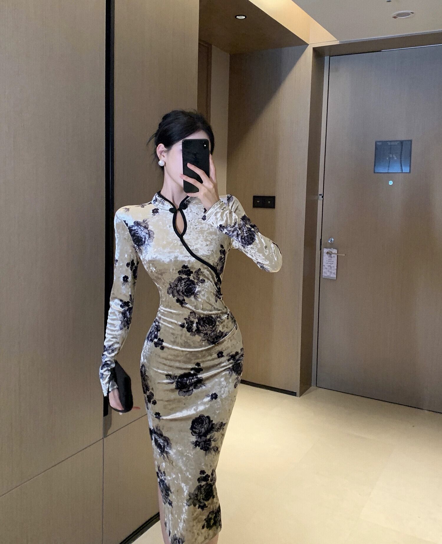 秋と冬のチャイナドレスの女性のハイエンド改良バージョンのレトロな中華民国スタイルの日常のベルベットの淑やかな気質のミドル丈のドレス オータム 秋物 ウィンター 冬物 yeyij9754861818