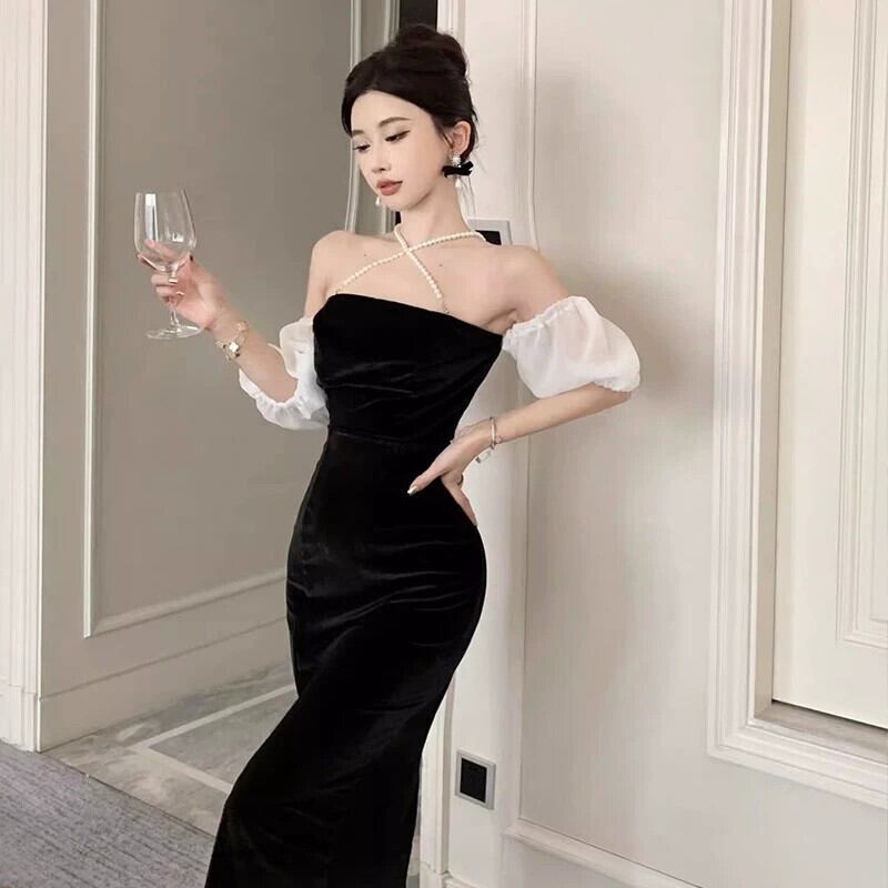 フランスのイブニングドレスの女性、ハイエンドの年次総会、ニッチな宴会、ランタンスリーブ、セクシーなワンショルダークロスホルターネックドレス yeyij40924150737