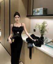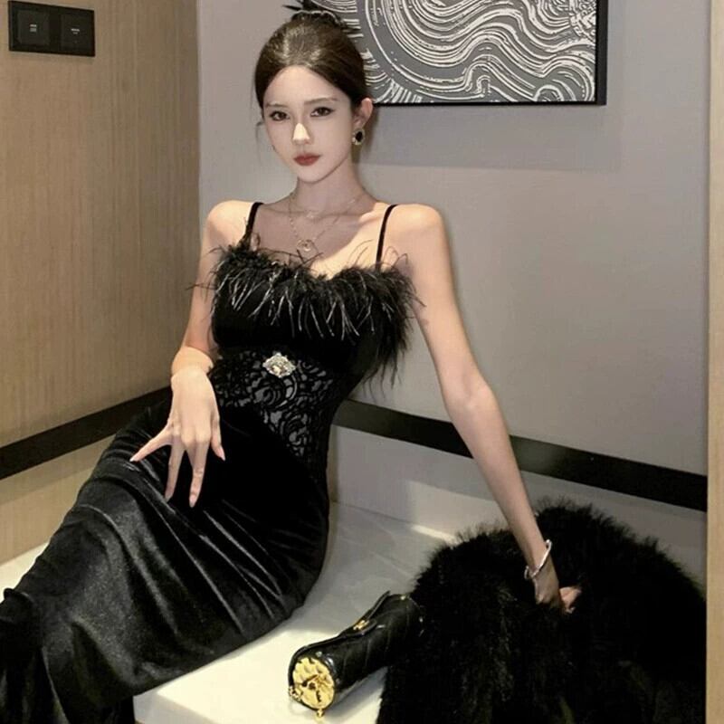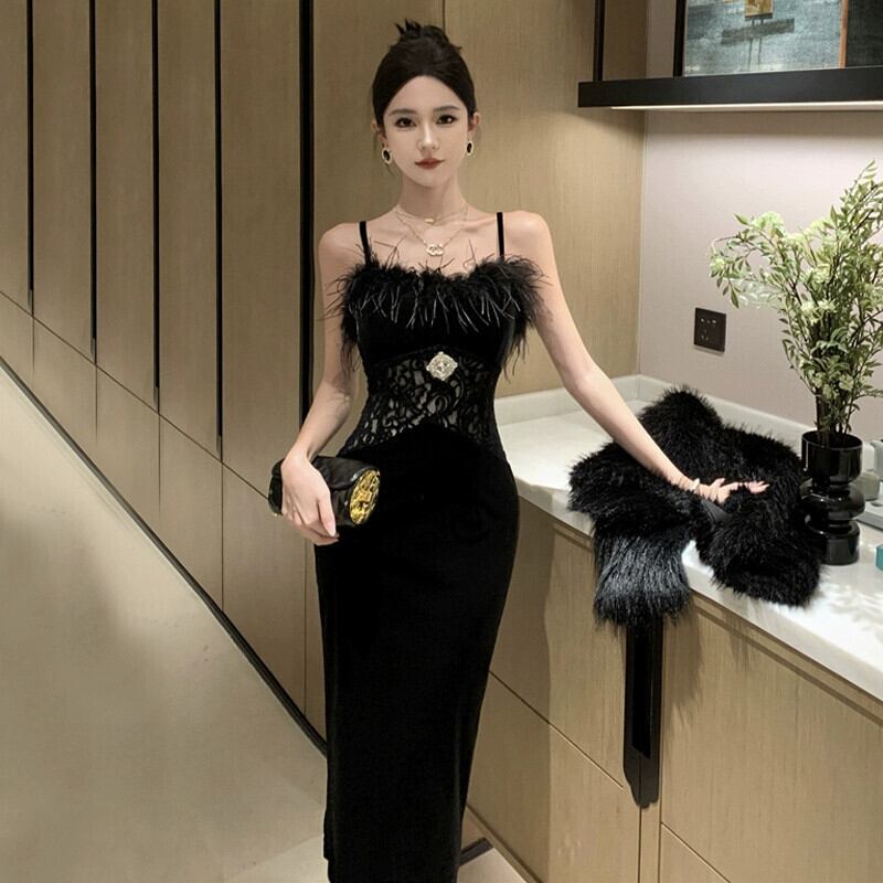 黒のイブニングドレスロングスカート女性ハイエンドライト高級ニッチハイエンドレーススプライシングフェザーセクシーなサスペンダードレス ブラック yeyij36021555593
