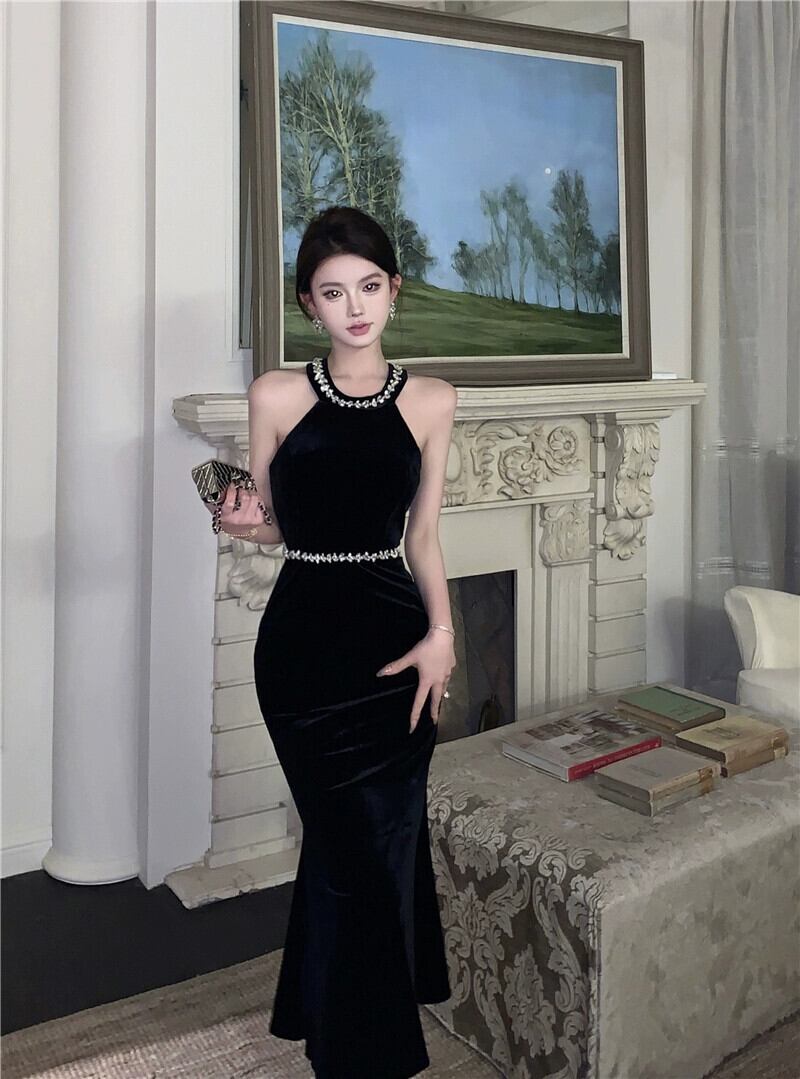 ヘップバーン スタイルのイブニング ドレス、フェミニン、ライト ラグジュアリー ニッチ、ハイエンド フレンチ セクシー ブラック フィッシュテール ホルター ネック ドレス yeyij55960461638