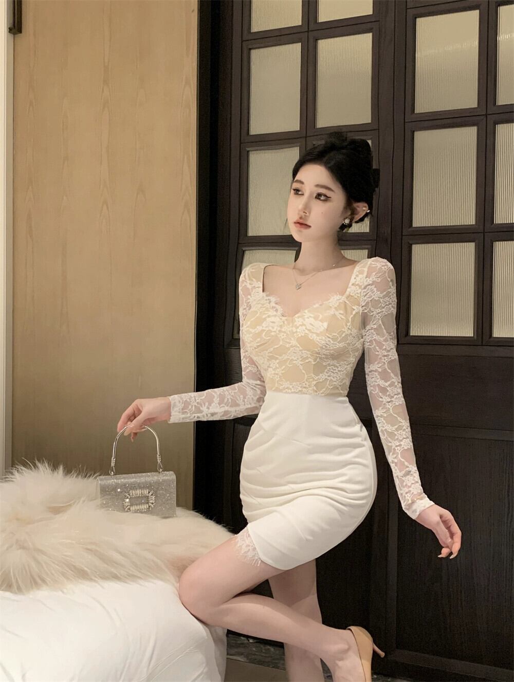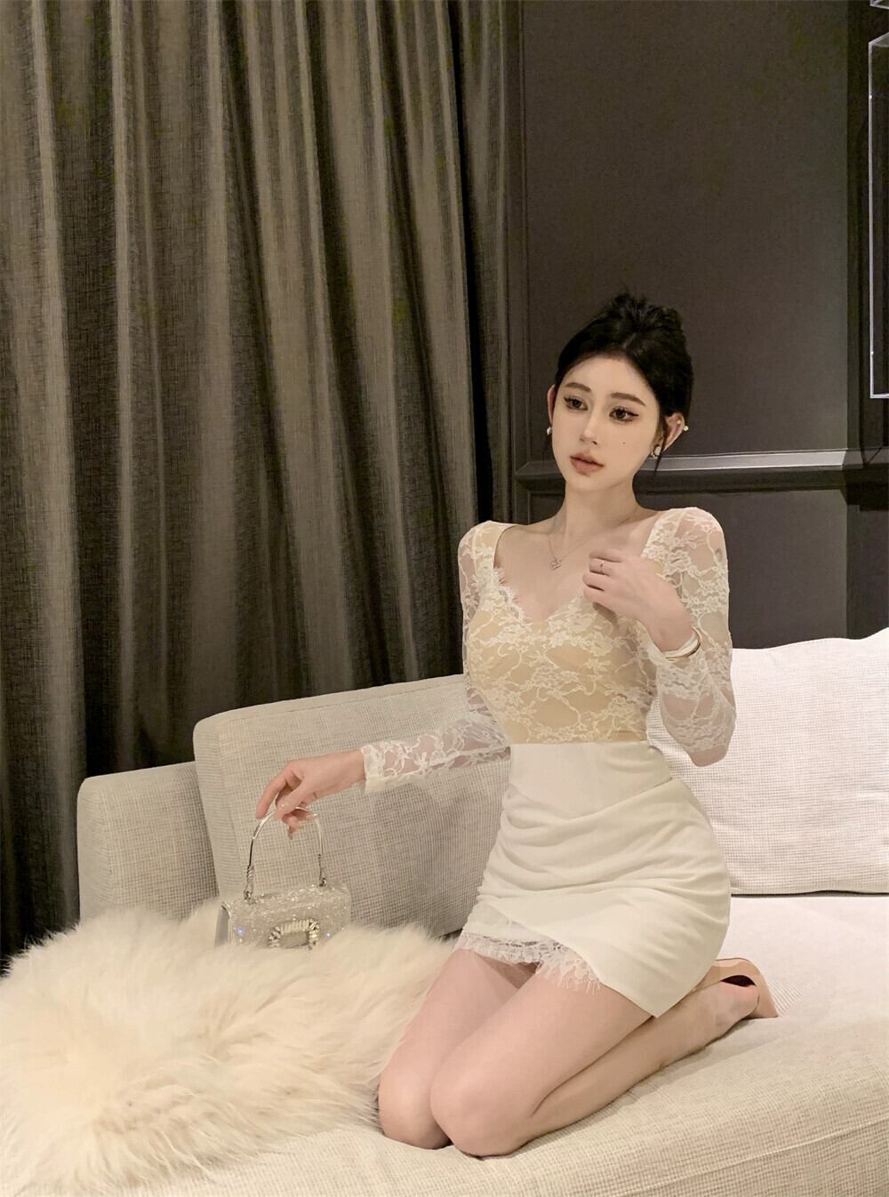 生放送の女性アンカーのポージェニックな服、ハイエンドの純粋な欲望スタイルのフレンチスクエアカラーのセクシーなレースのスプライシングボトムドレス ピュア スクウェア yeyij24946206810
