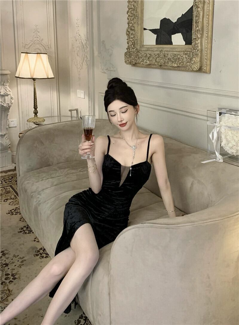 宴会イブニングドレス、ハイエンド女性フランス年次パーティーセクシーなローカット深いVネックゴールドベルベットロングスカートサスペンダードレス yeyij46782462179