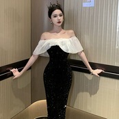 ヘップバーン スタイルのイブニング ドレス、フェミニン、ライト、ラグジュアリー、ニッチ、ハイエンド、フレンチ スタイルのセクシーな黒のスパンコール付きワンショルダー ドレス ブラック yeyij96047239523