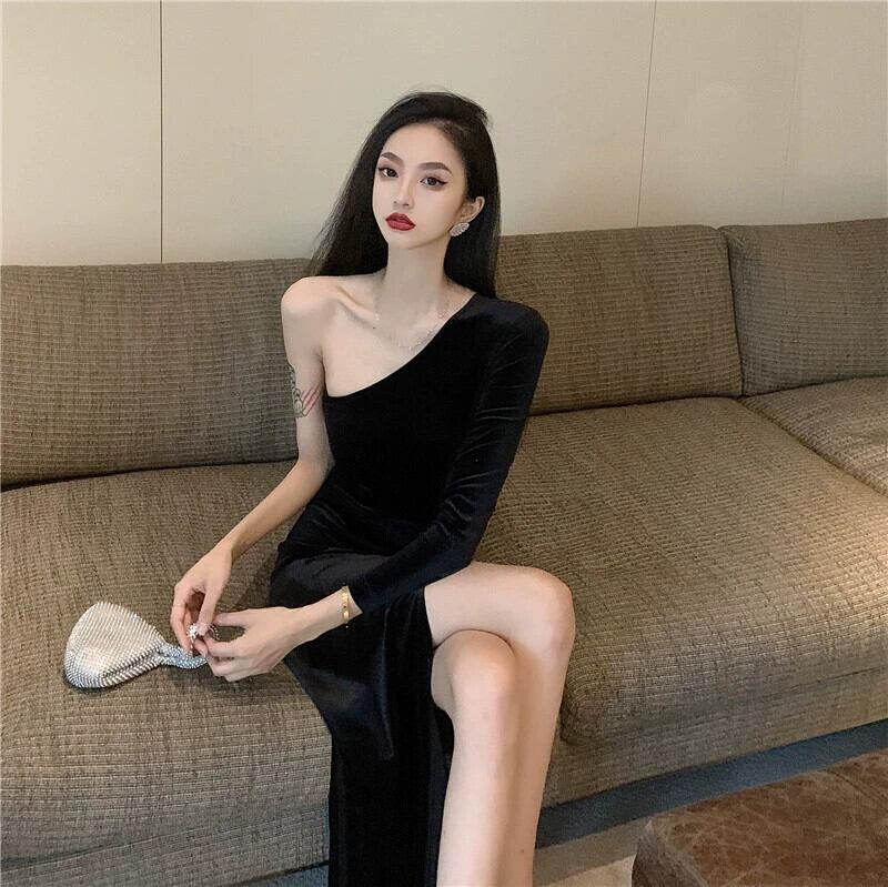 イブニングドレスの女性 2024 新しい秋と冬のスタイル女王スタイルのセクシーなスリットロングスカートスロープネックオフショルダーゴールドベルベットドレス オータム 秋物 ウィンター 冬物 yeyij46670705110