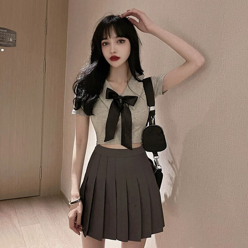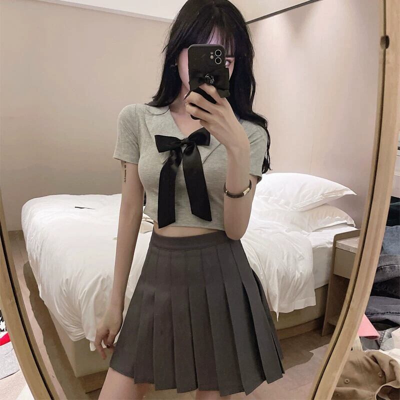 ナイトクラブ作業服 JKユニムスーツ フェミニンショートへそ出しトップスリボンTシャツ+プリーツショートスカート yeyij84109768361