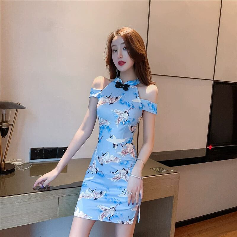 インターネットセレブのアンカー服、フェミニンでセクシーなオフショルダー、スリム、ショートホルターネックチャイナドレス改良版ドレス yeyij68872791640