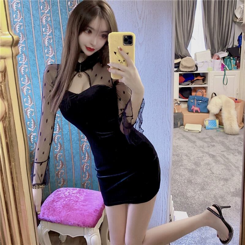 インターネットセレブアンカー服女性 pogenic セレブ気質セクシーなローカットメッシュスプライシングゴールドベルベットヒップハグドレス yeyij43993358495