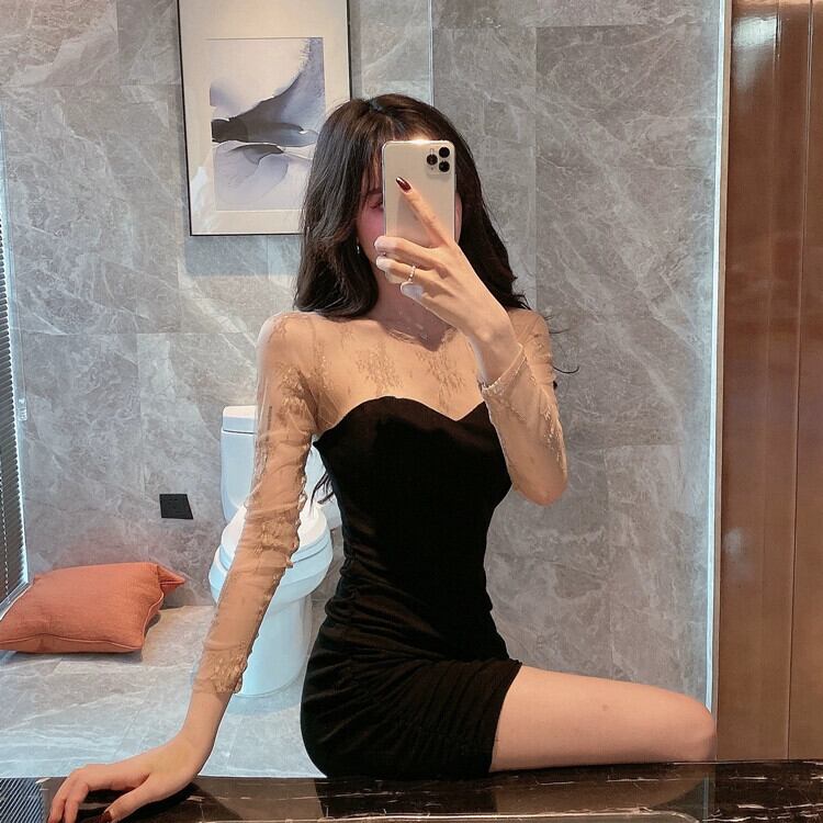 メッシュドレス春 2023 女性の有能レーススプライシング長袖スリムフィットヒップカバー痩身ボトリングスカート ロング スプリング 春物 スリムヒップ yeyij79372159260