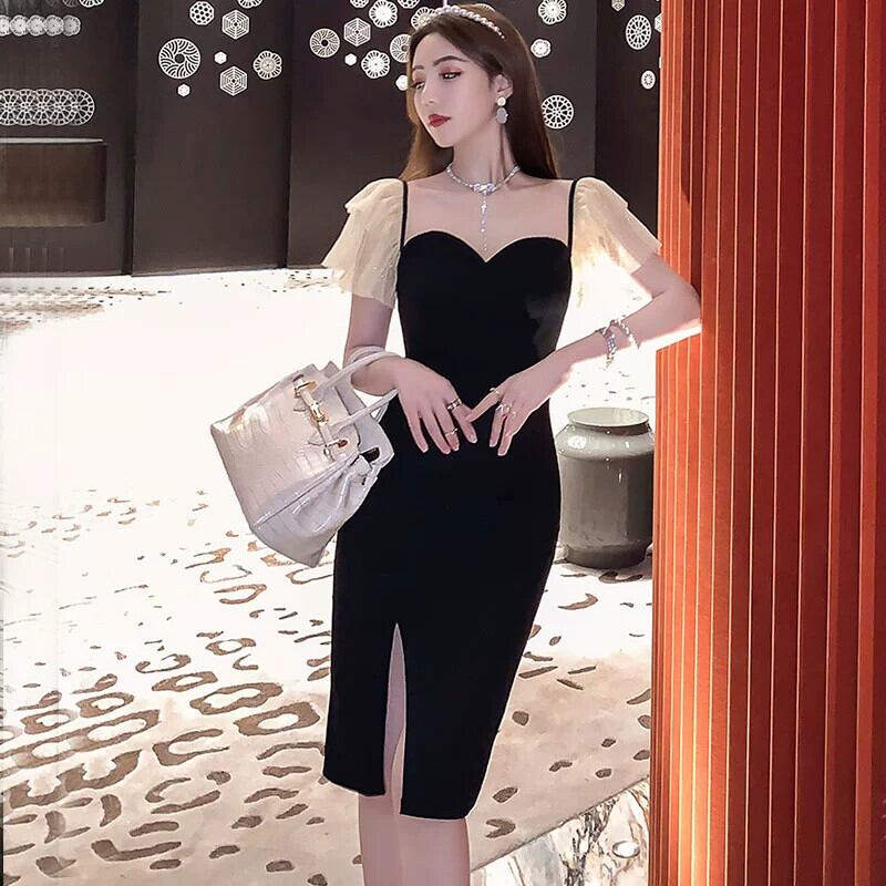 イブニングドレス、レディライク、高貴、メッシュ、トランペットスリーブ、気質、セクシーなローカット V ネックスリムミドル丈ドレス Vネック yeyij24663017411
