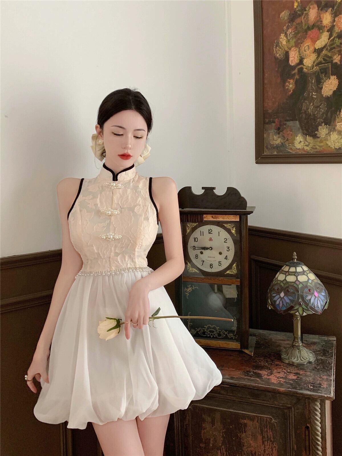 改良されたチャイナ ドレス若い、夏のフランスのスーパー フェアリー セクシーなノースリーブ メッシュ スプライシング短いふくらみのあるドレス ショート サマー 夏物 yeyij75045143444