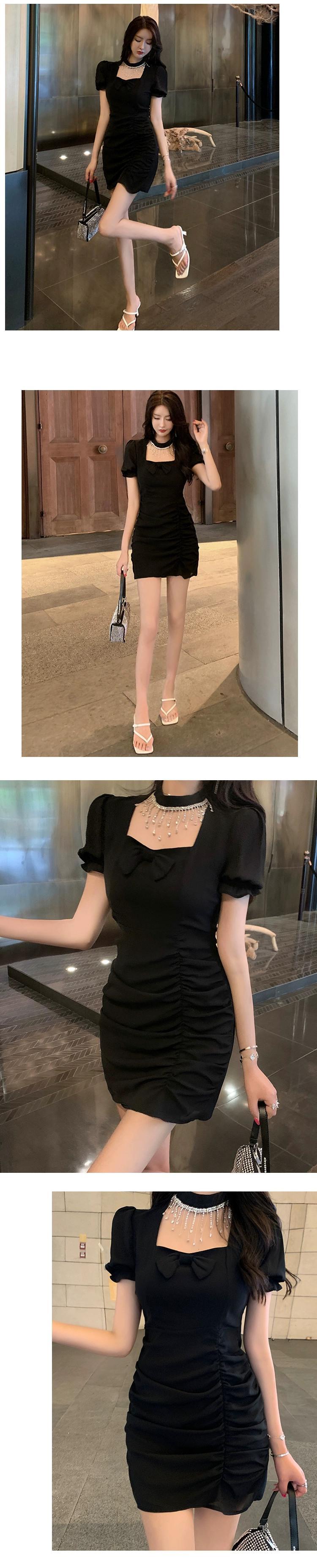 フレンチニッチチャイナドレス女性の夏改良版ヤングスタイルパフスリーブラインストーンチェーンセクシーな中空ヒップドレス サマー 夏物 yeyij52412115809