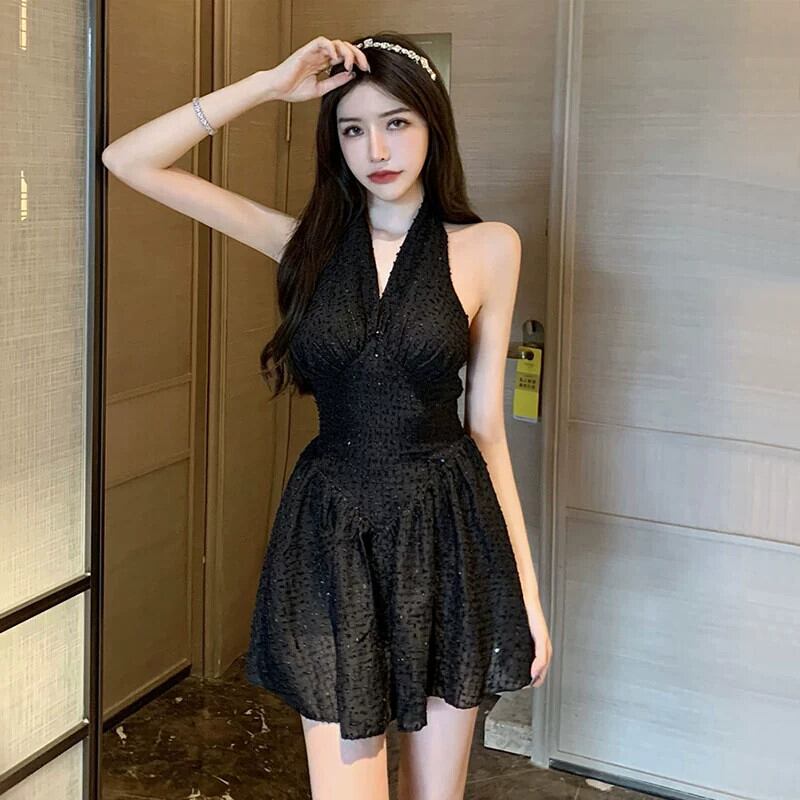 イブニングパーティーエレガントリトルドレスショートナイトクラブ女性のセクシーな V ネック背中の開いたふくらんストラップホルターネックドレス Vネック yeyij25686610256