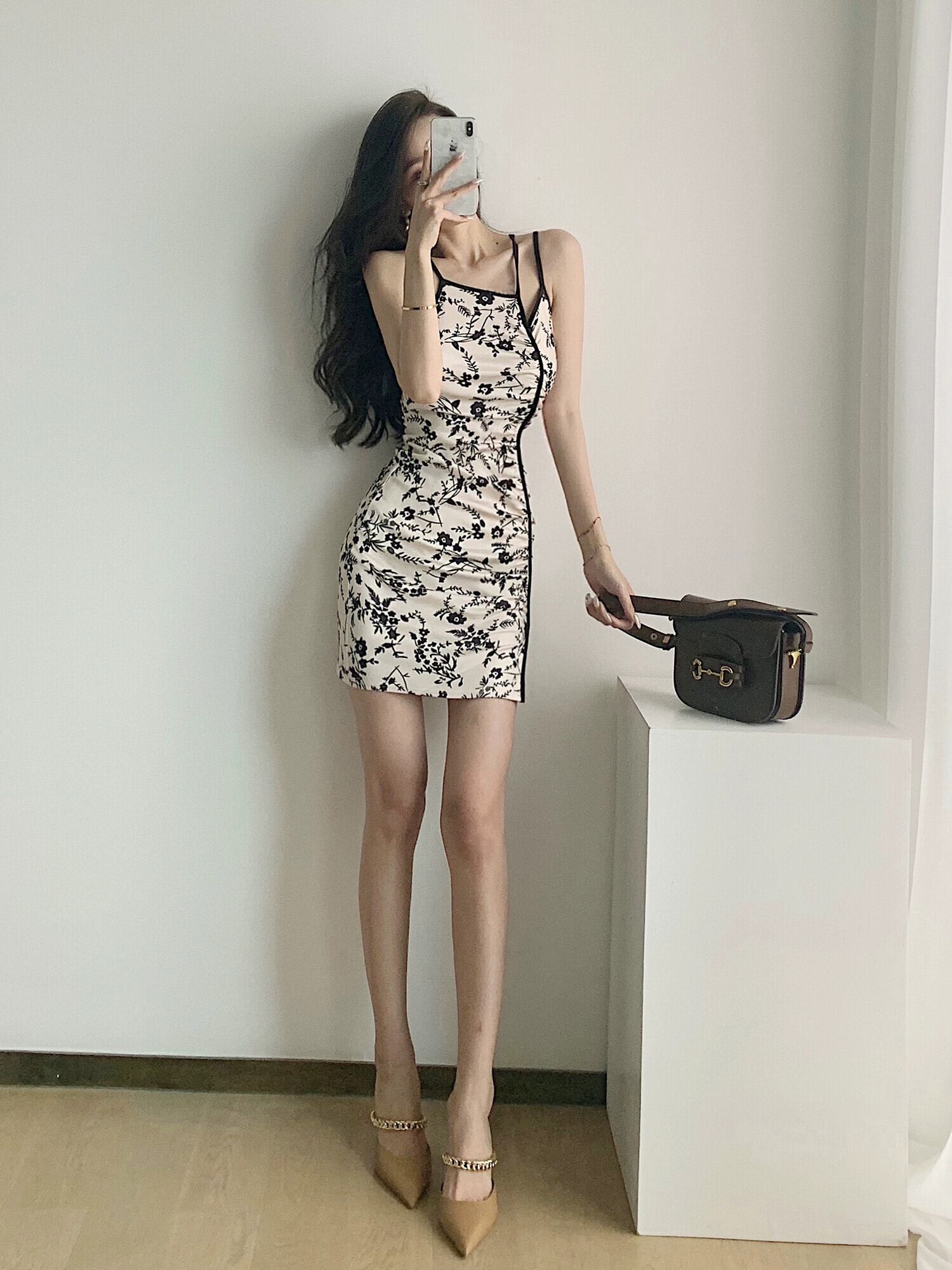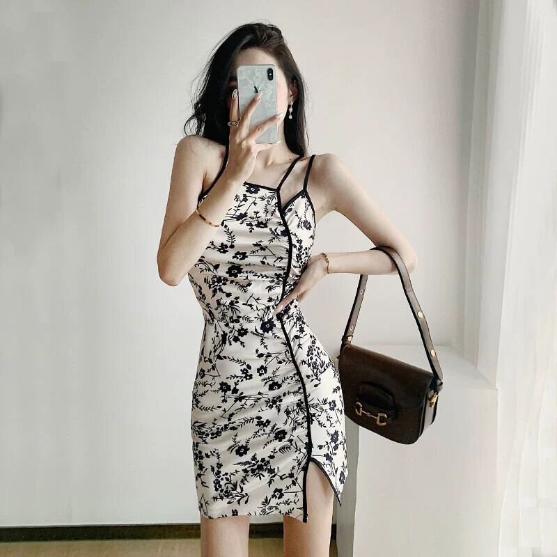 2023 夏の新スタイルの女性のインターネットセレブフレンチレトロプリントセクシーなヒップハグスリットチャイナドレス花柄サスペンダードレス サマー 夏物 yeyij46267452471