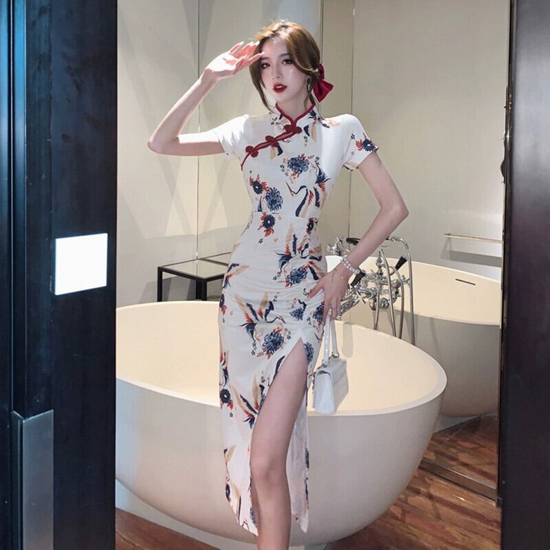 チャイナドレス若々しいスタイルのハイエンド改良版夏レトロ鶴プリントセクシーなスリットミドルドレス サマー 夏物 yeyij8480756860