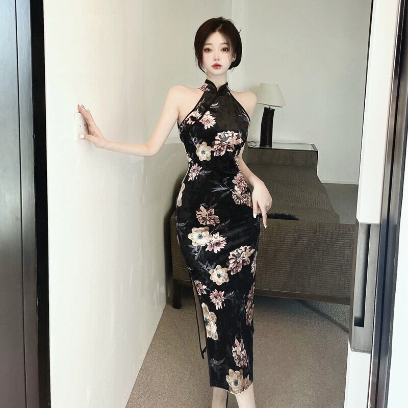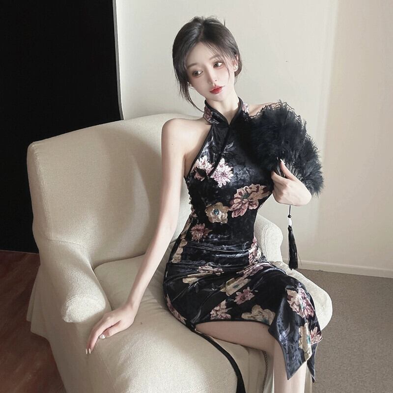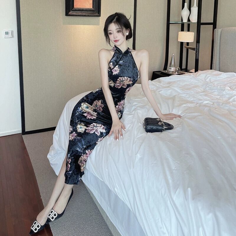チャイナ イブニング ドレス、軽くて豪華なニッチ ハイエンドの中国風のセクシーな背中の開いた修正されたゴールド ベルベットのミッドレングス ドレス yeyij47863235531