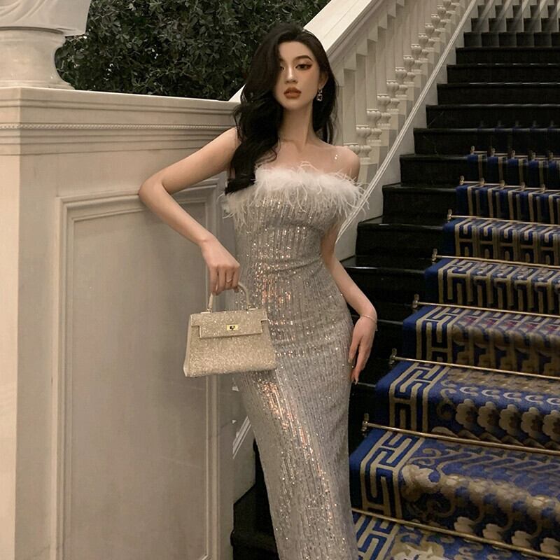 イブニングドレス、ライトラグジュアリー、ニッチ、ハイエンド、ハイエンド、スパークリング、スパンコール付き、ダチョウの羽のチューブトップドレス yeyij13377483206