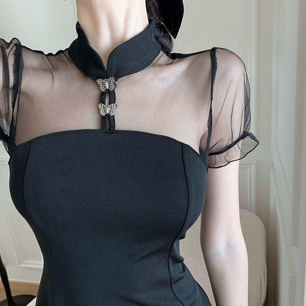 中国風の改良された黒チャイナドレス 2023 新しい夏の若いスタイルのセクシーなメッシュスプライシングドレス ブラック サマー 夏物 yeyij21285549775