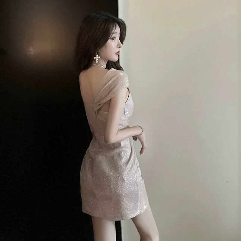 バンケットスタイルショートドレス、スパークリングシルクナイトクラブレディースセクシーなスラントカラーワンショルダーサスペンダーチューブトップドレス yeyij42459435338