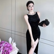 ヘップバーン スタイルのイブニング ドレス、フェミニン、ライト ラグジュアリー ニッチ、ハイエンド フレンチ セクシー ブラック ゴールド ベルベット サスペンダー ドレス yeyij77222790192