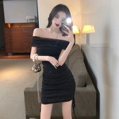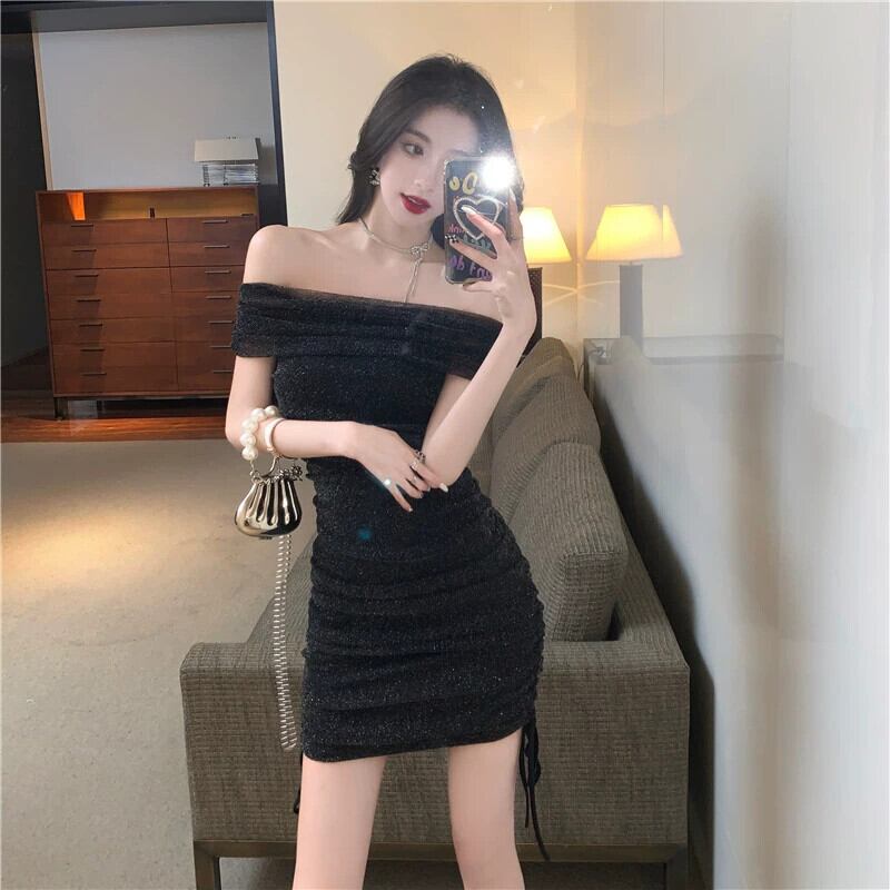 ナイトクラブの女性のスパークリングシルクブラックリトルドレスショートスタイルセクシーなセクシーなワンラインショルダーバッグヒップドレス yeyij2344574195