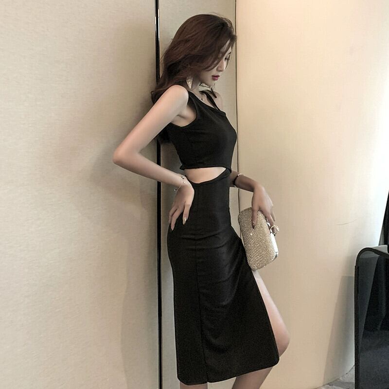 ブラックのイブニングドレス、ハイエンドのライトラグジュアリー、ニッチ、ハイエンド、セクシーな斜めの襟、ワンショルダー、オフショルダーのミッドレングスのサスペンダードレス yeyij56004045697