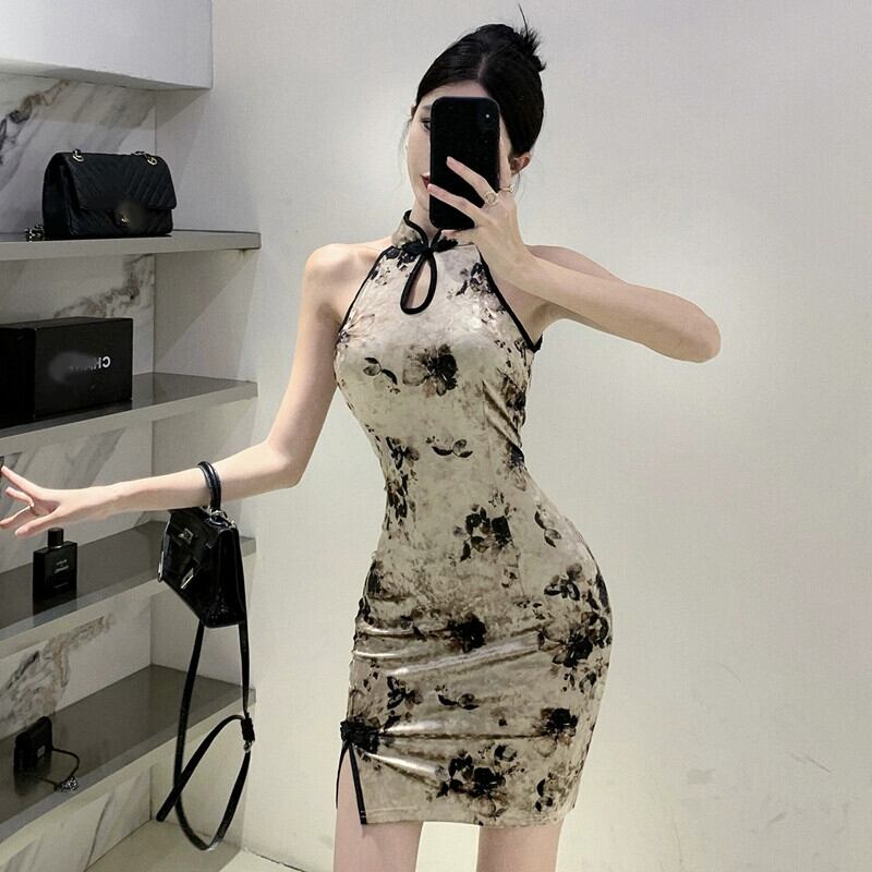 生放送服女性アンカー pogenic 中国風の若いセクシーなスリット ゴールド ベルベット修正されたチャイナ ドレス yeyij79492748323