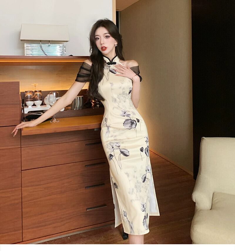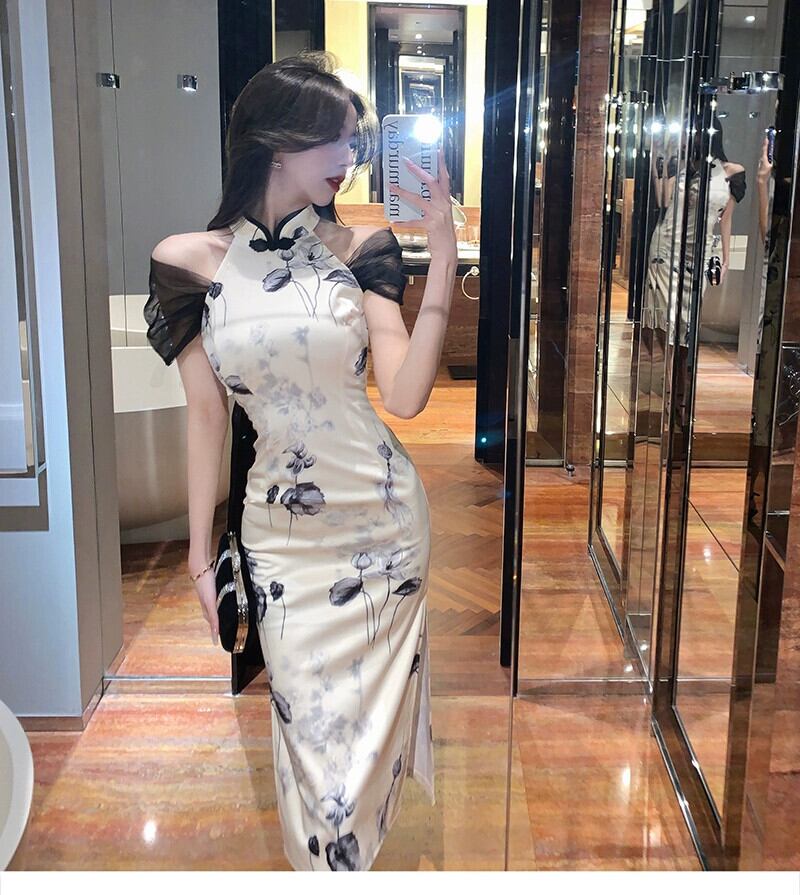 チャイナドレス若い高級イブニングドレス気質改善国民風セクシーなオフショルダーミドル丈ホルタードレス yeyij88504475691