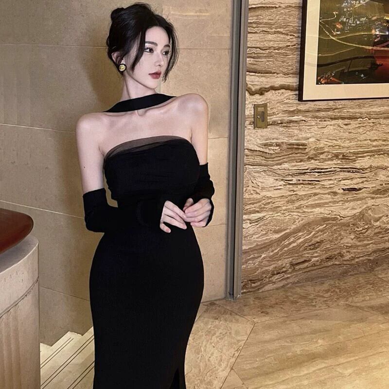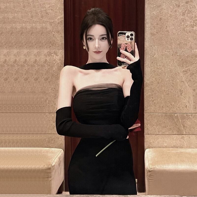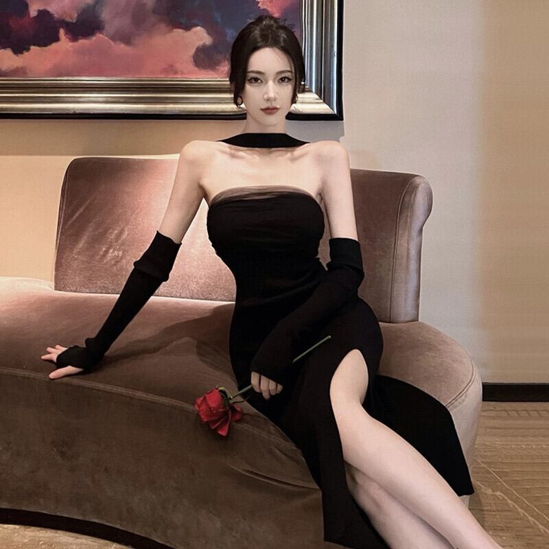 黒のイブニングドレス、フェミニン、ラグジュアリー、ニッチ、ハイエンドロングドレス、フレンチセクシー、見事なホルターネックチューブトップドレス ブラック yeyij67402187147